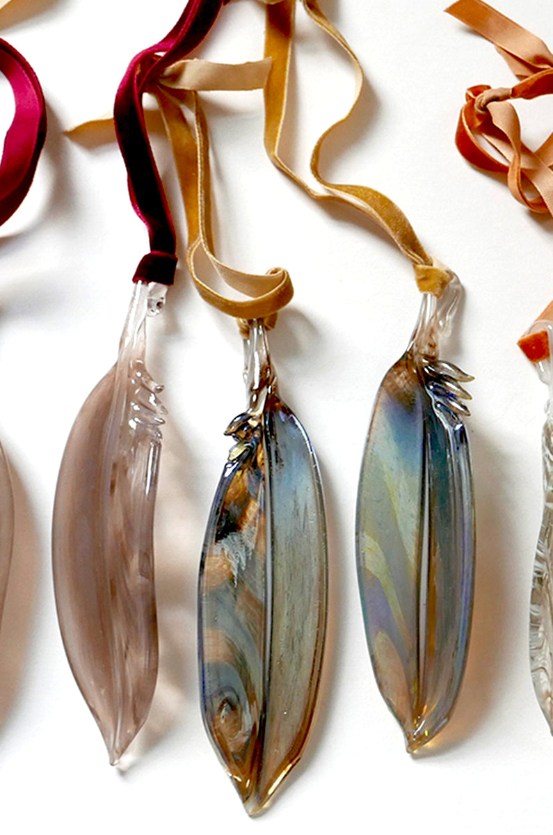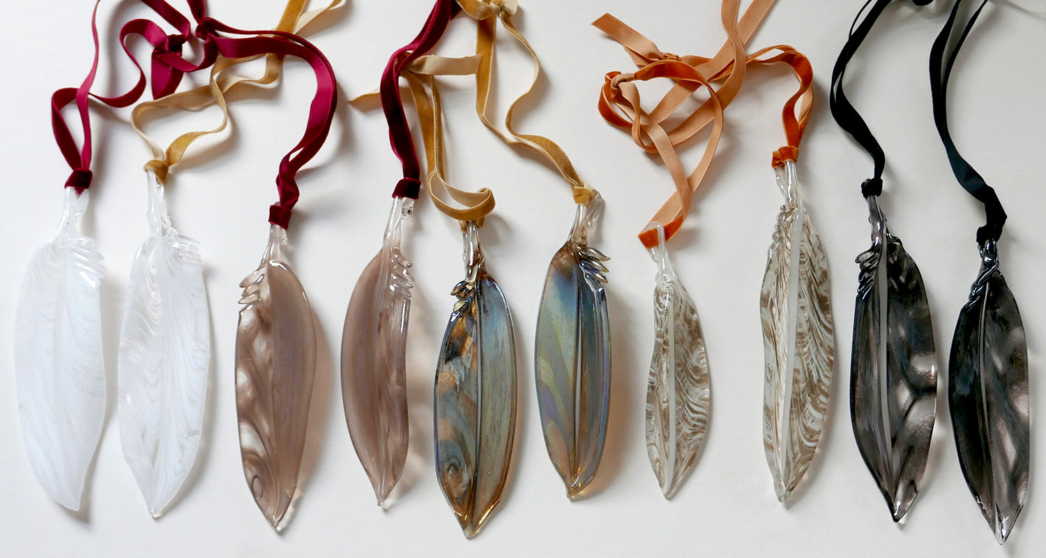 Delicate handblown hanging feathers, each one capturing a moment of joy in its fleeting light.