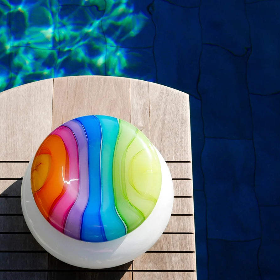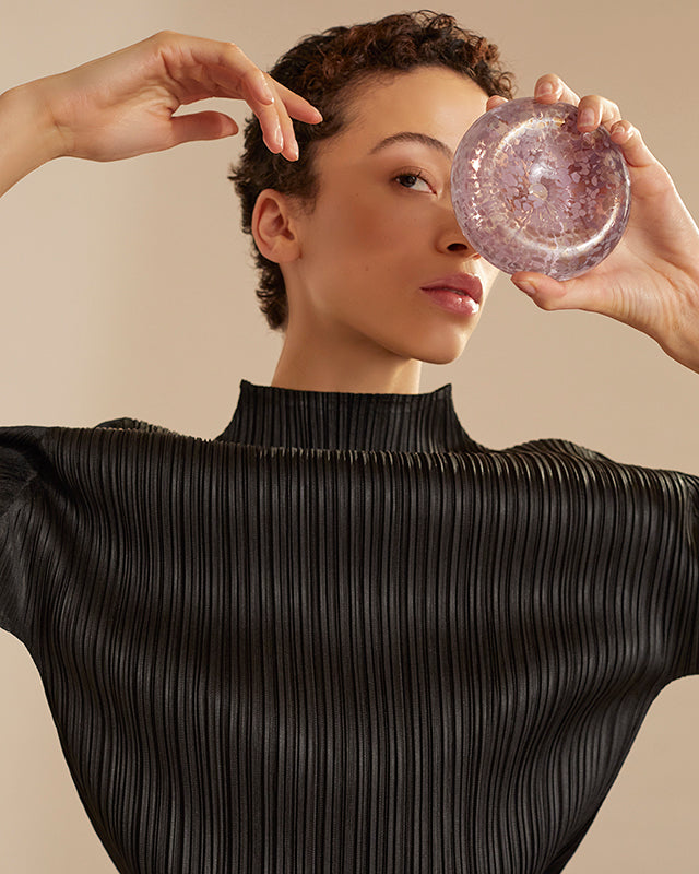 Organically free-blown into cylindrical forms with gentle folds to reflect light and fluidity. Layers of opaque speckles cast colourful shadows in sunlight.